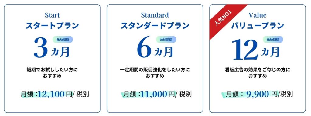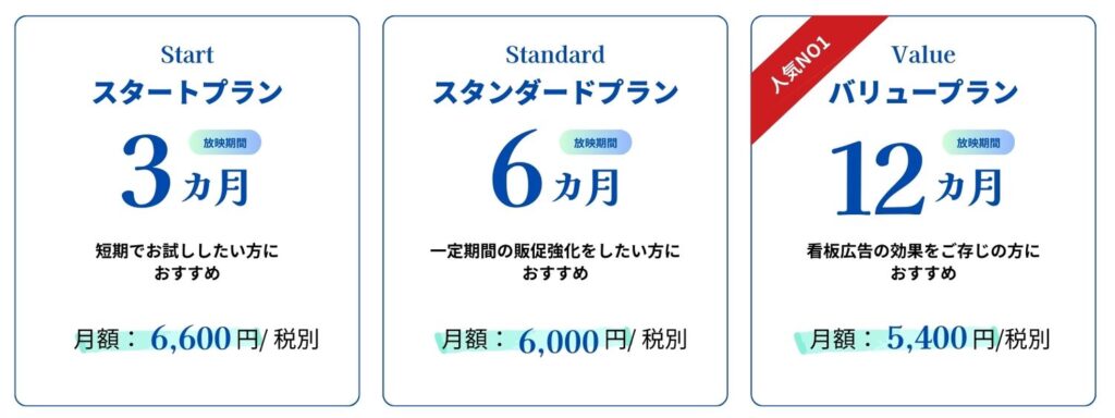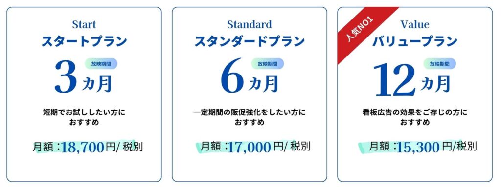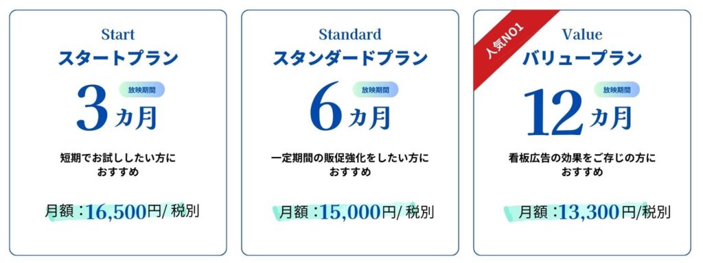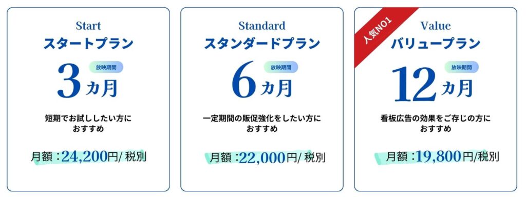 最短3か月から掲載可能、6か月、12か月と長期になるほどお得な料金プランです。