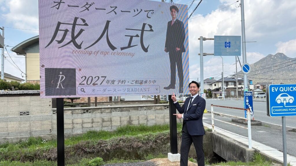その後、2026年の契約更新のタイミングで、防府市 新橋町ビジョンへ掲載場所を変更しました。同時に広告内容も見直し、成人式向けオーダースーツのPR広告へ変更されています。