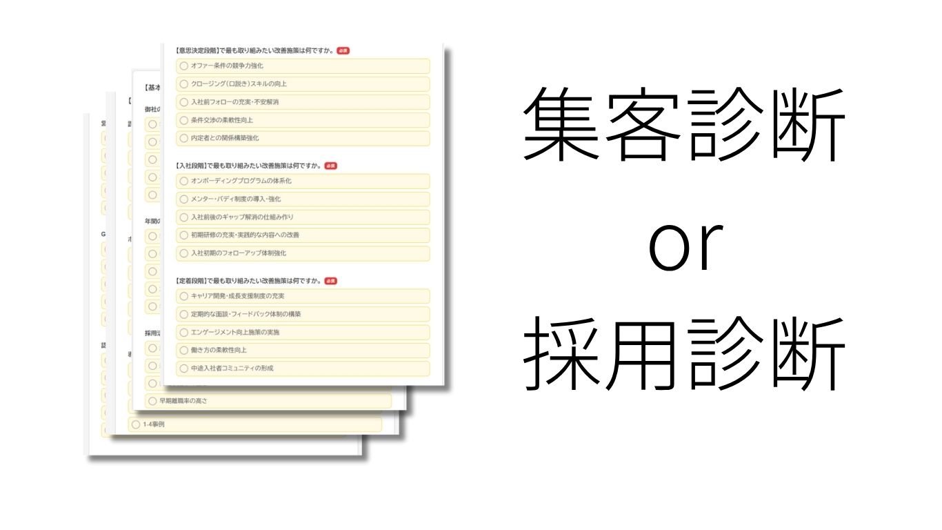 集客or採用の強化したいカテゴリでオンライン診断を実施。設問数はカテゴリによって60~70問(5~10分程度)です。回答内容は自動で当社に送付されます。