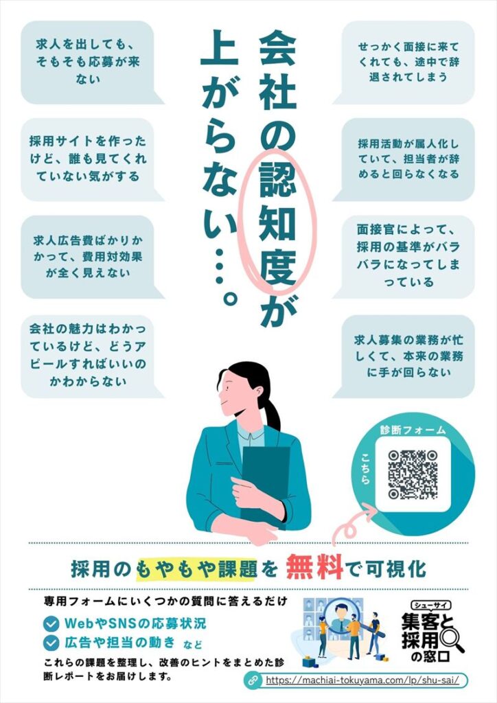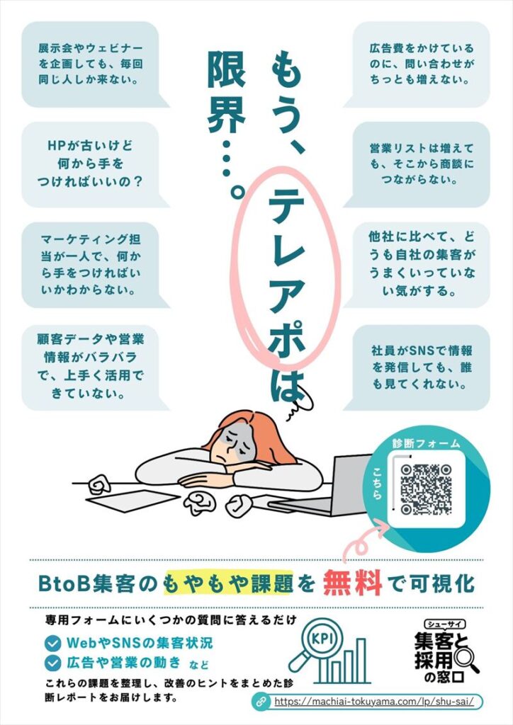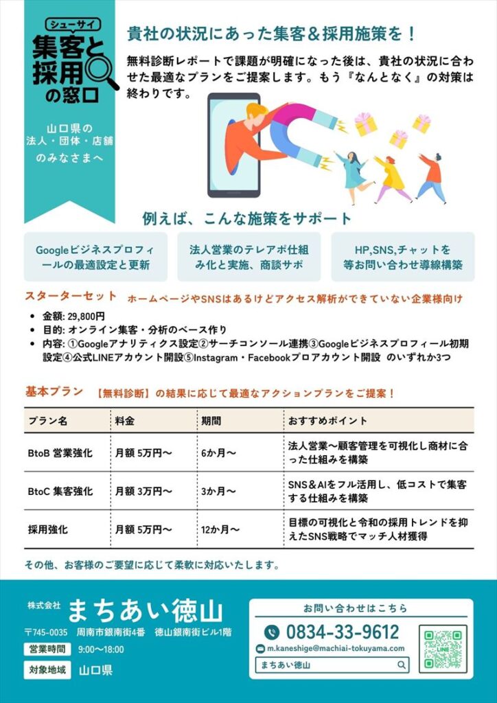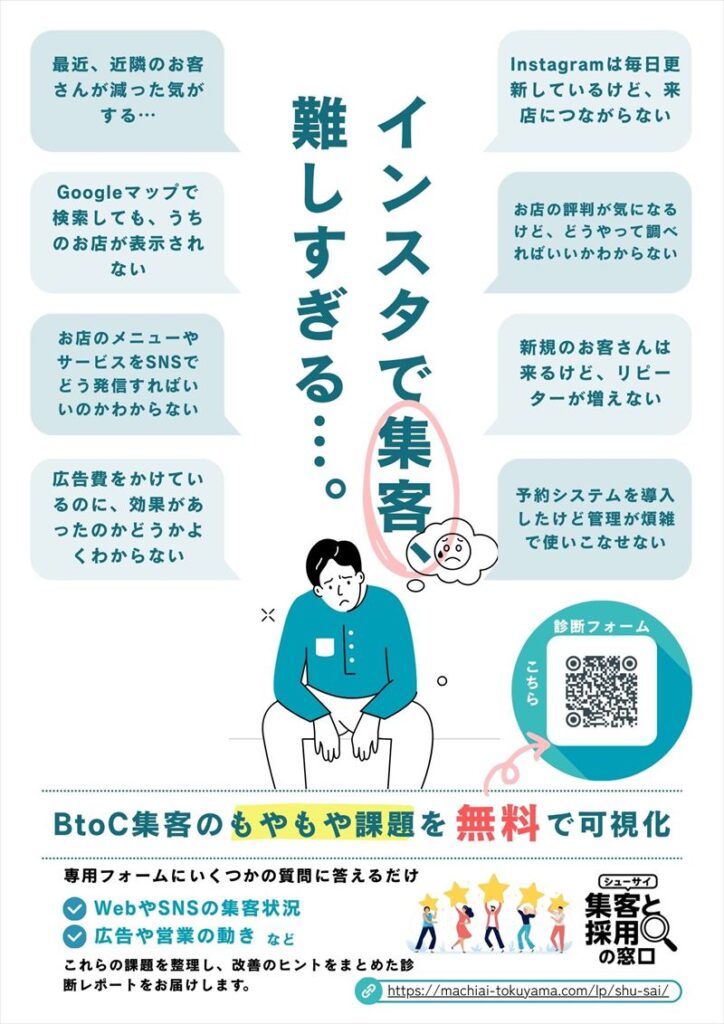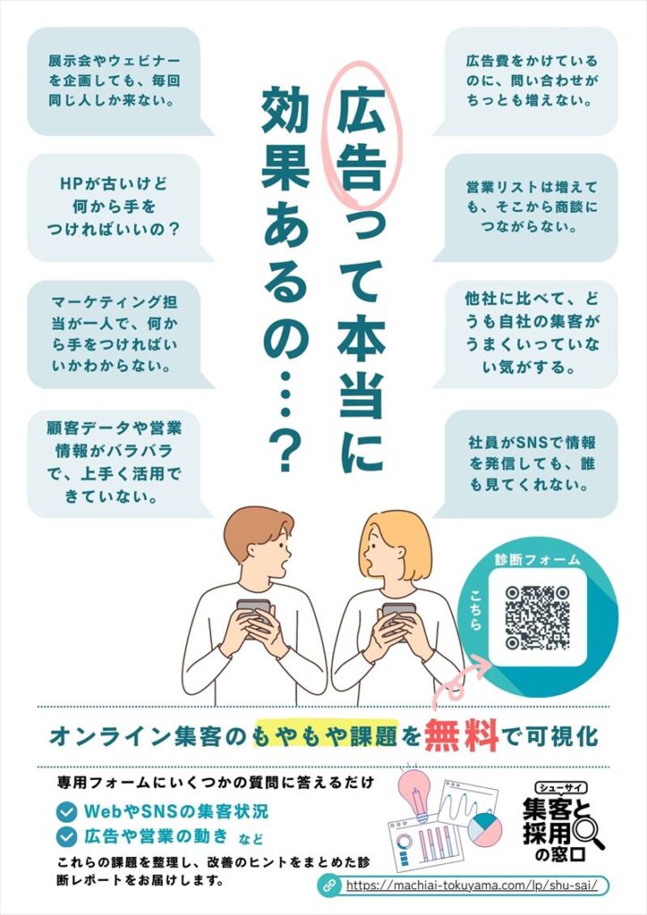 そこで、我々がまちづくり関連事業で培った、デジタル/データマーケティングや情報管理、SNS活用など「広義でのマーケティング~業務改善」の実務ノウハウがお役に立つのでは、と思い体系的に整理致しました。まずは無料診断での現状可視化、それをもとに「まちあい徳山に包括的に任せたい」と思っていただけるようサービス化(有料プランのご用意がございます)しています。無料診断を有効活用していただき、便利そう・成果が出そうだとご納得いただけたら、ぜひ有料プランをご検討いただけると嬉しいです。