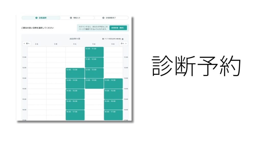 診断後の自動メール送付時に、面談カレンダーのリンクを送付いたします。ご都合の良い日程をお選びください。