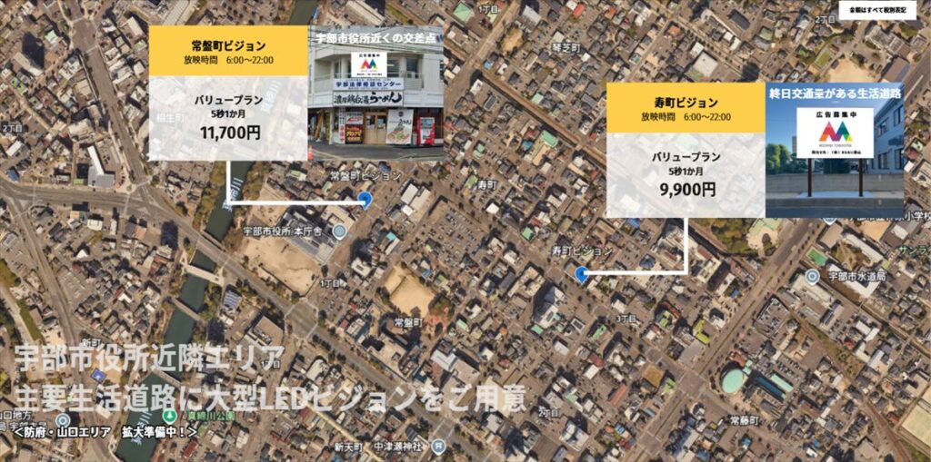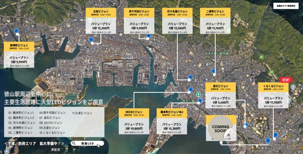 現在、周南市内に10面、宇部市内に2面の大型LED看板を運営しております。LEDビジョンならではの自由度で動く看板広告を掲載いただけます。