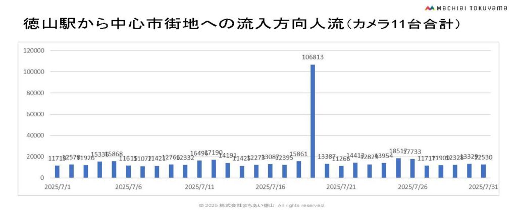 徳山駅周辺の人流データ 2025年7月 2026 1/15 データベース 2025年8月21日2026年1月15日 測定期間:2025年7月1日~2025年7月31日 調査データの権利に関する表記 AIカメラ設置位置 目次徳山駅から中心市街地へ流入人流(カメラ11台合計) 中心市街地11台カメラの平均値 徳山駅みゆき口前カメラ1台 徳山デッキD1前カメラ1台 銀座通り南側3台のカメラ平均値 銀座通り北側3台のカメラ平均値 銀南街3台のカメラ平均値 徳山駅みなと口カメラ1台 徳山駅みゆき口タクシー乗り場前カメラ1台 徳山駅御幸通りカメラ1台 南銀座通り入口カメラ一台 PDFダウンロード データベース よかったらシェアしてね! URLをコピーしました! URLをコピーしました! 大型LEDビジョン完成 周南市古泉交差点 古泉Vision 【Youtube公開】ChatGPTに社外秘を聞かせるな!【中小企業が知らないとヤバいAIリスク】 関連記事 徳山駅周辺の人流データ 2026年1月 2026年2月12日 徳山駅周辺の人流データ 2025年12月 2026年1月15日 徳山駅周辺の人流データ 2025年11月 2025年12月10日 徳山駅周辺の人流データ 2025年10月 2025年11月11日 徳山駅周辺の人流データ 2025年9月 2025年10月3日 徳山駅周辺の人流データ 2025年8月 2025年9月10日 徳山駅周辺の人流データ 2025年6月 2025年7月10日 徳山駅周辺の人流データ 2025年5月 2025年6月11日